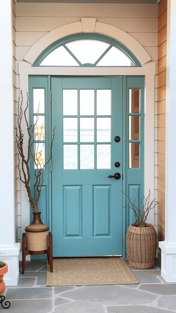 This lovely entrance welcomes you with a refreshing ocean-inspired blue door. The natural elements like the potted plants and woven baskets add a warm touch. It’s the perfect spot to enjoy those laid-back beachy vibes right at home!